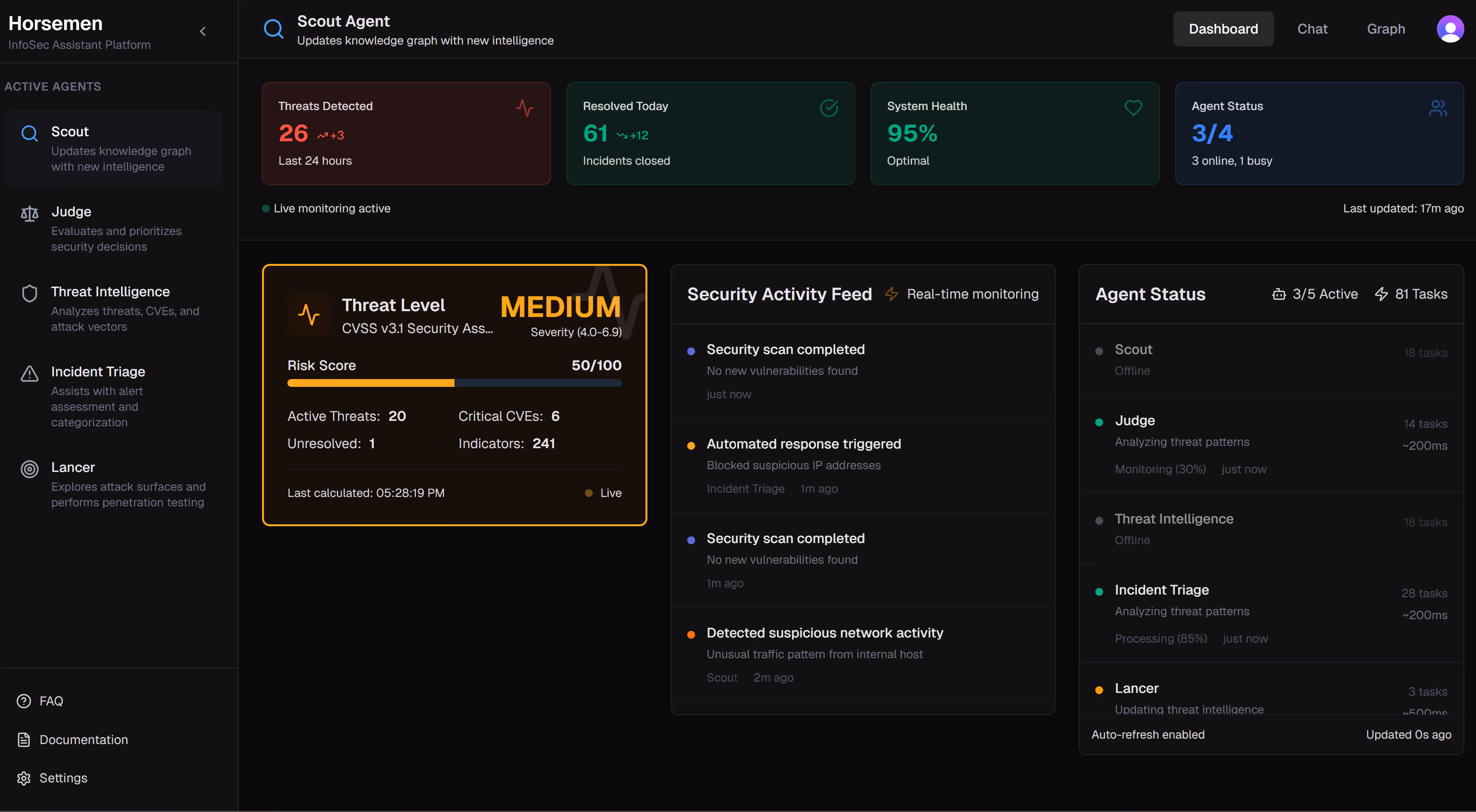 Real-time threat scoring, agent coordination, vulnerability tracking, and compliance status—unified in a single autonomous interface. The system explains itself, acts for you, and auto-generates reports to the FBI or appropriate authorities. Fully auditable.